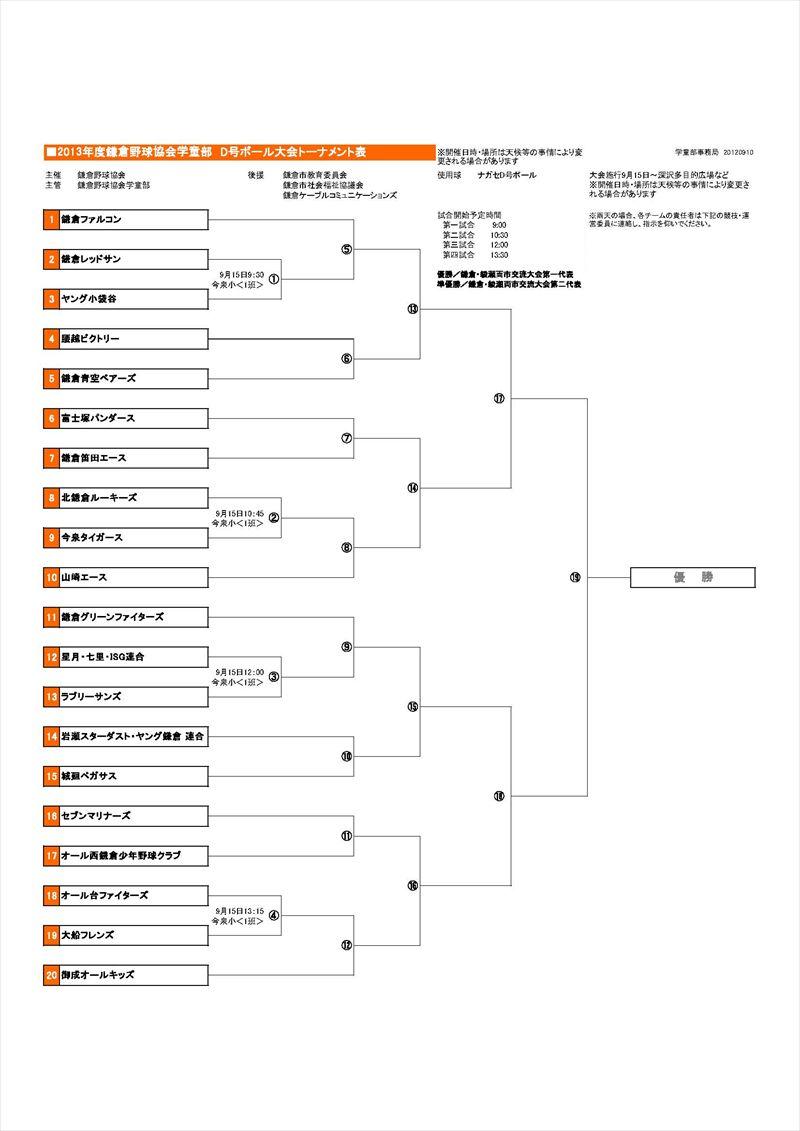 2013年度鎌倉野球協会学童部 D号ボール大会トーナメント表を掲載します。レッドサンの初戦は9/15 9:30~ 今泉小学校で対ヤング小袋谷戦です。試合番号① ベンチは1塁側です。