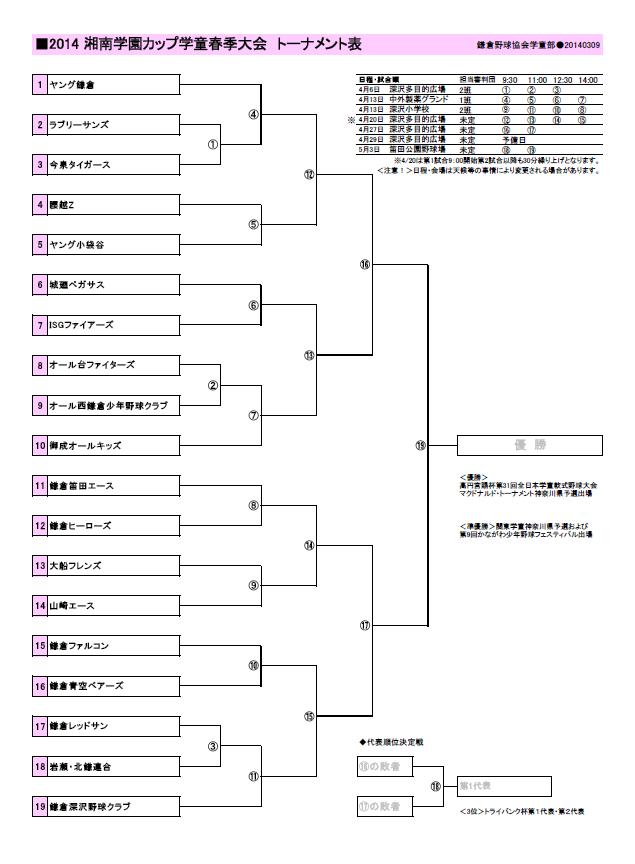 2014年学童部春季大会(湘南学園杯)組合せが決まりました 。初戦は岩瀬、北鎌倉連合チームと深沢多目的広場で第3試合(12:30開始)の予定です。組み合わせ表については後ほど掲載いたします。