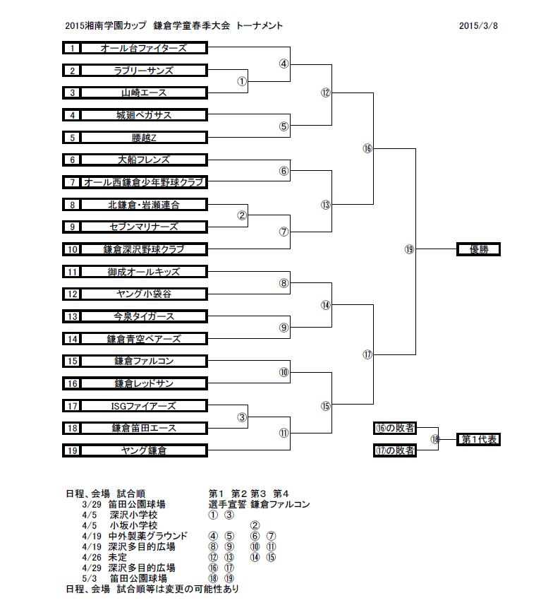 初戦は抽選の結果4/19(日)鎌倉ファルコンと深沢多目的広場で第3試合の予定です。組み合わせ表についてはレッドサンで作成したものを掲載いたします。参加にあたり保護者の方はスケジュール変更等の連絡にご注意ください。大会参加に当たって車両制限や入場制限等についてチームからの連絡事項を必ず確認願います。詳細については予定連絡等をご参照ください。ご不明な点は練習時グラウンドにてスタッフにお問い合わせください。